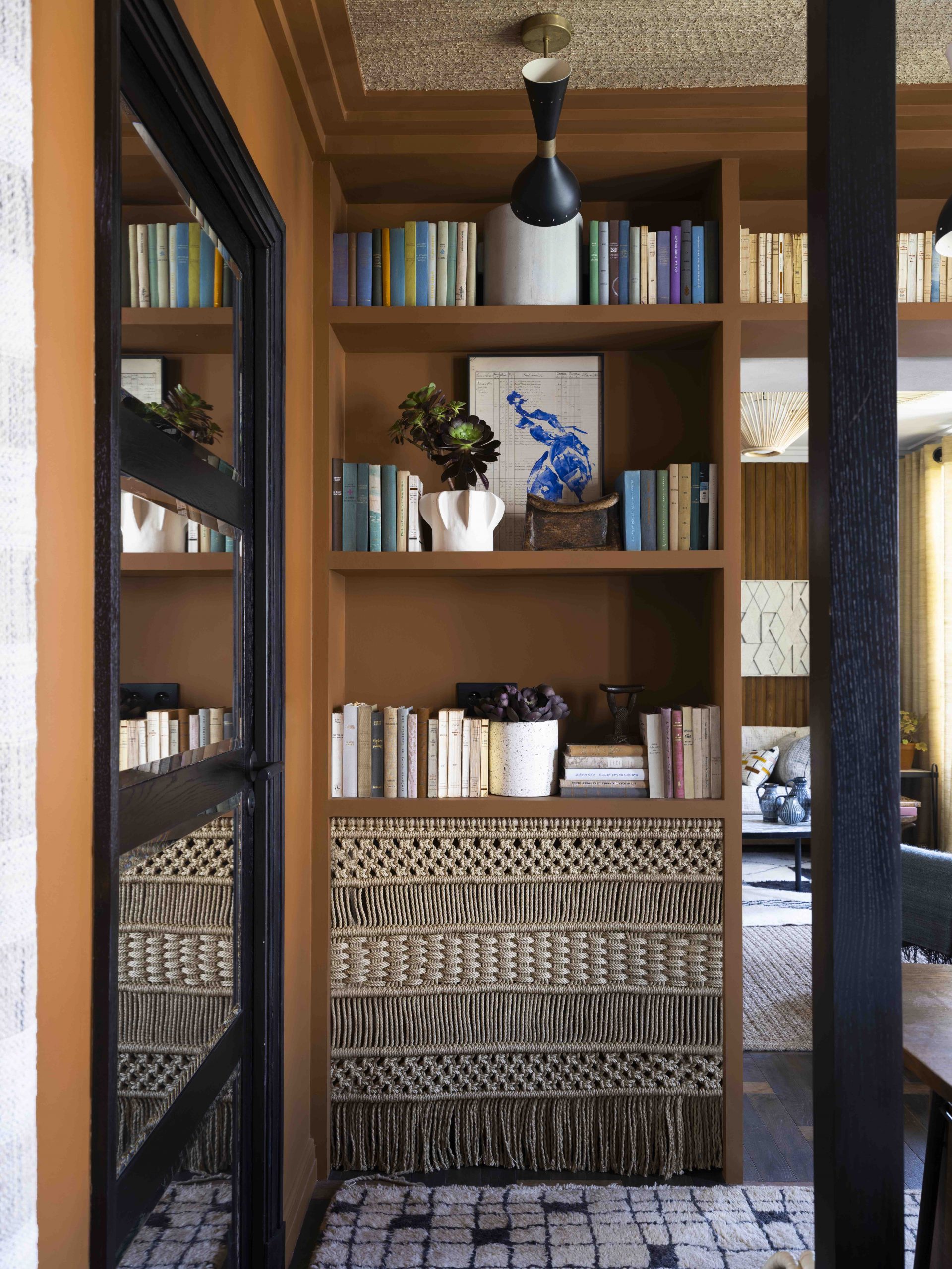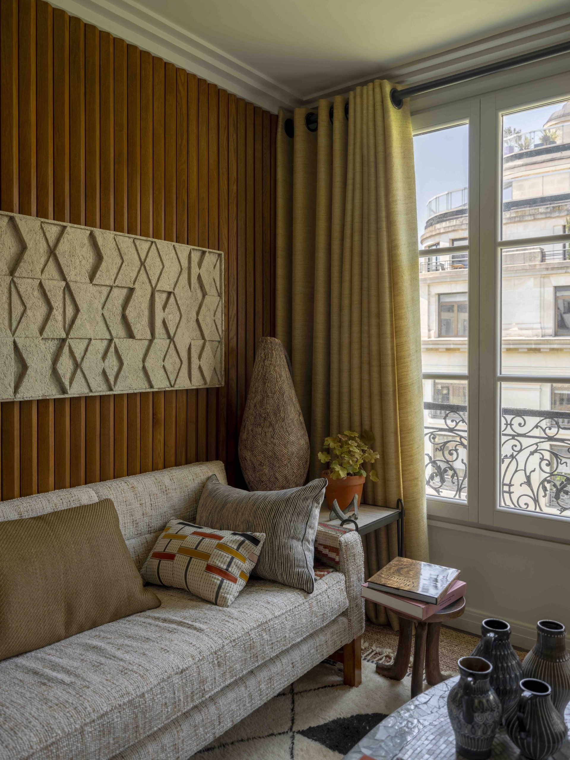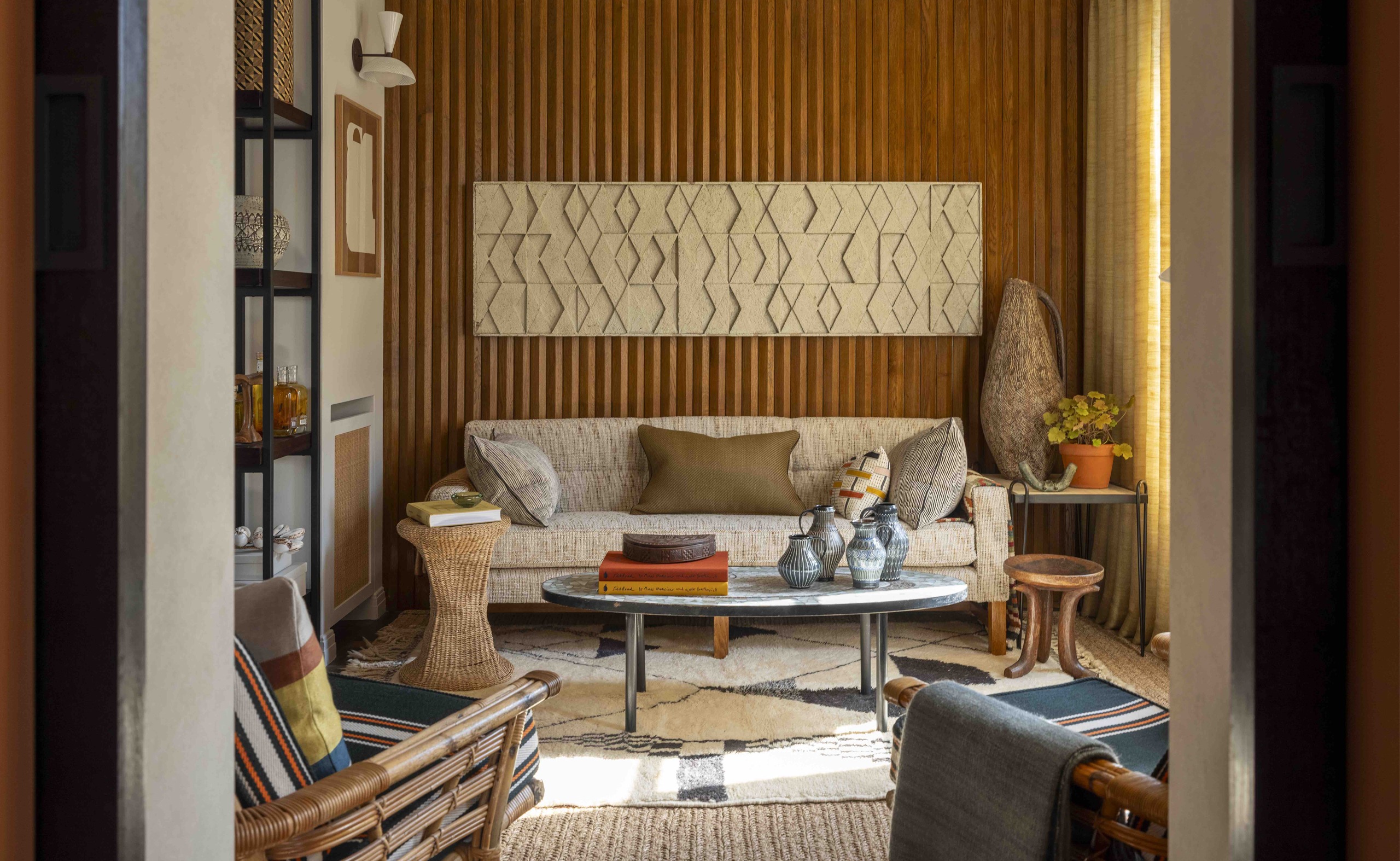 The design draws deeply from the client’s personal world - his home in Provence, his passion for African art and his lifelong collecting. Ochres, sun-warmed neutrals and richly textured natural materials establish a palette that feels both transportive and timeless. Bespoke joinery, artisan-crafted elements and carefully curated artworks and books create layered interiors that balance intimacy with practicality. Conceived almost as a private hotel suite, the apartment offers a softened reflection of the client’s identity, designed to feel warm, joyful and effortlessly lived in.